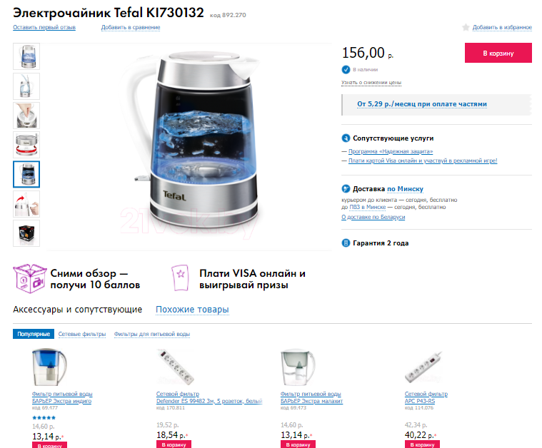 На сайте интернет-магазина в категории товара «Электрочайники» пользователь выбирает конкретную модель. Справа от изображения товара ему предлагаются сопутствующие услуги (Up-sell), а ниже Аксессуары и сопутствующие товары (Cross-sell).