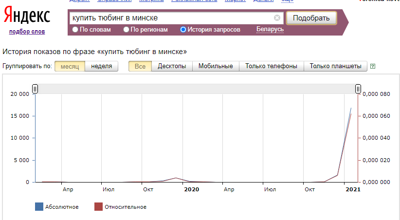 Нажав на историю запросов, появится график запросов по месяцам. По нему можно сделать вывод о сезонности данного товара. Например, рост частотности запросов на покупку тюбингов наблюдается с декабря по январь. Летом же он вообще не пользуется популярностью. Опираясь на полученные данные, можно сделать вывод об ожидаемом спросе на конкретный товар интернет-магазина.